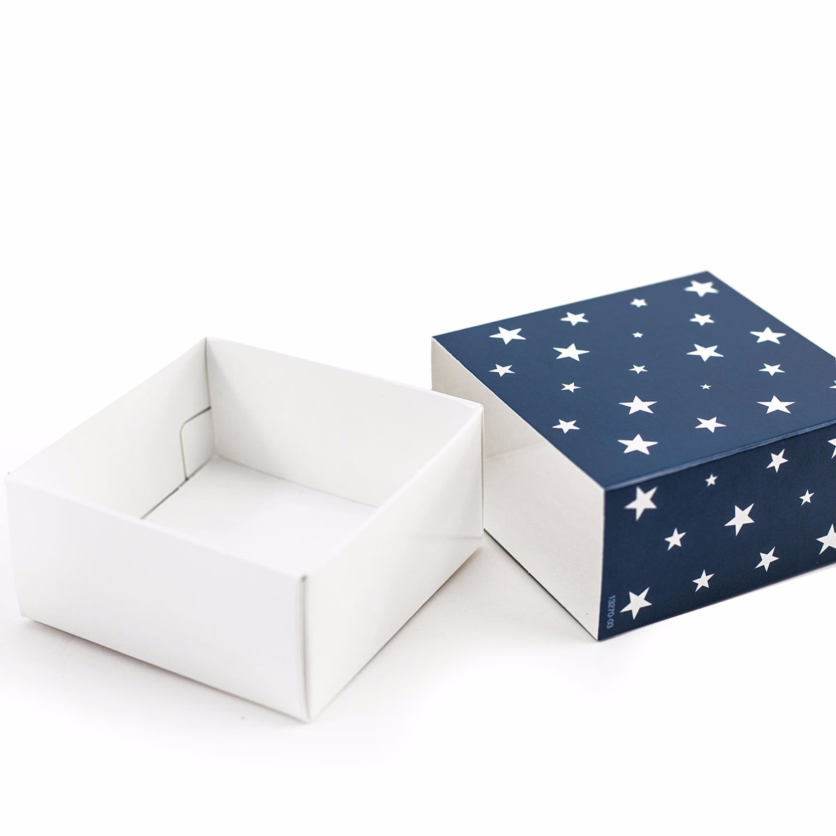 Caja con exterior de color azul oscuro y estrellas blancas. Interior blanco.